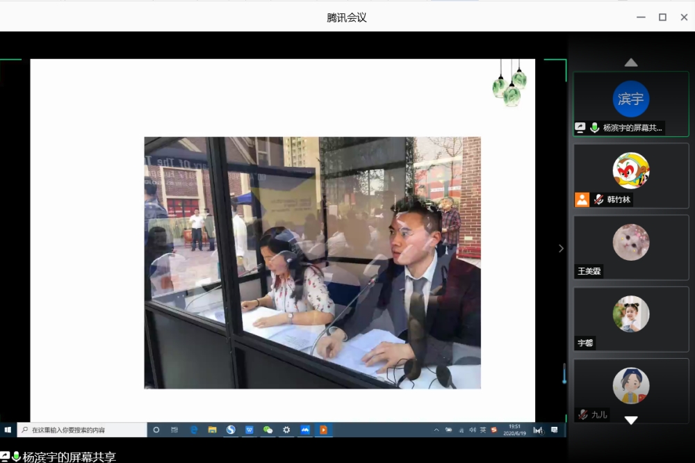 6月19日,公司校外兼职硕导、CATTI同声传译杨滨宇老师应邀在线为公司师生做了第三场镜泊翻译沙龙系列学术讲座,题为“口译行业与职业发展”。公司2019级翻硕研究生,2017级、2018级翻译专业本科生和部分教师参加了本次讲座。讲座由伟德体育研究生教研部主任韩竹林副教授主持。 杨老师从CATTI口译资格证书对翻译职业发展的重要性开始谈起,逐步展开,通过分享他个人的口译职业经历,深入浅出地讲解了在同声传译、交替传译和陪同口译等不同的口译工作环境下译者需要注意的事项。同时强调了译前准备、现场临机反应的必要性,探讨了AI背景下翻译质量问题,最后分析了口译的就业前景。