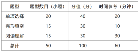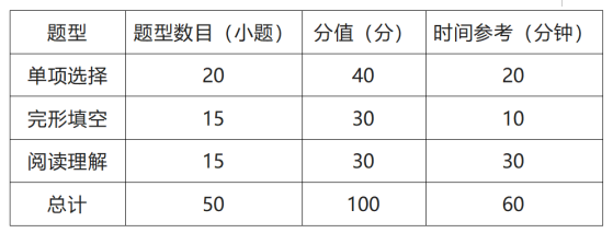 满分为100分,时间为60分钟,共3种题型50道题,全部为客观题。参赛选手不得使用任何纸质词典、电子词典和工具书。