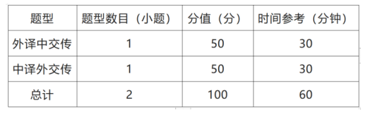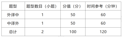 满分为100分,时间为120分钟,共2种题型2道题,全部为主观题。参赛选手可使用中译外、外译中纸质版词典各1本。