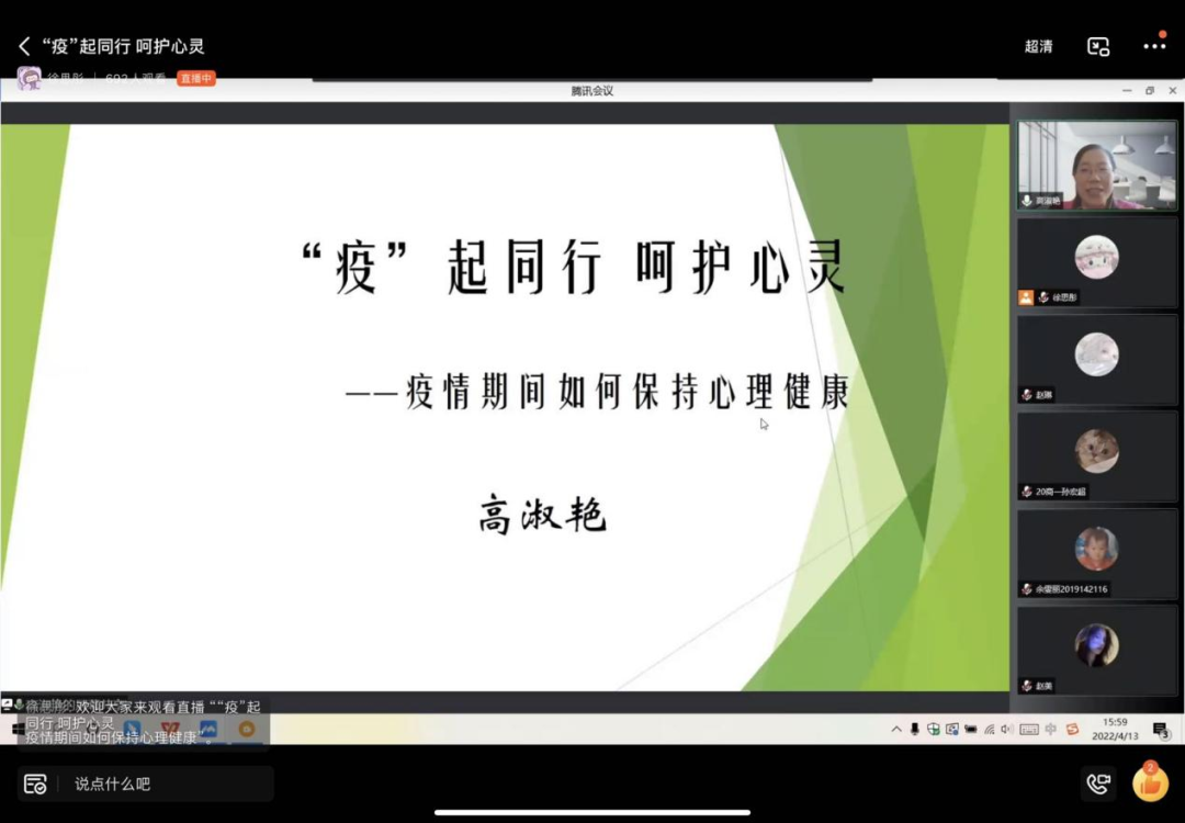 为切实做好疫情防控期间员工的心理健康工作,帮助员工有效应对疫情防控期间产生的心理困扰及情绪波动。4月13日下午四点,公司举办了疫情期间心理健康云讲座——《“疫”起同行,呵护心灵,疫情期间如何保持心理健康》。公司党委书记才忠喜,党委副书记齐仲宇、各年级辅导员老师以及全体本科生、研究生在线聆听了讲座。