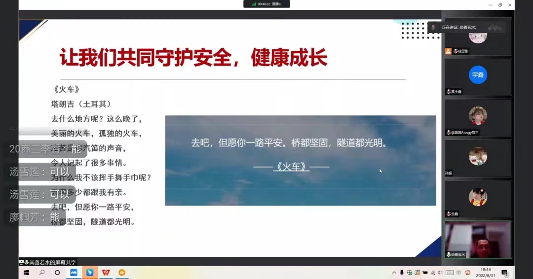 黄宇鑫老师对2022级新生入学工作进行了详细的安排和叮嘱。首先,黄老师对新生的开学报到、缴费、线上寝室操作等进行了指导,让新生摆脱迷茫,克服恐惧。其次,黄老师叮嘱22级新生要按公司要求按时返校,同时要深化疫情防控意识,做好返校途中的个人防疫措施。进入校园后还要注意宿舍防火、防电以及自身安全问题,进一步强化防诈骗意识。最后,黄老师表达了对22级萌新们的祝福:新学期,新起点,新转折,新征程,相信大家一定会把握人生航向,阅尽人生繁华!